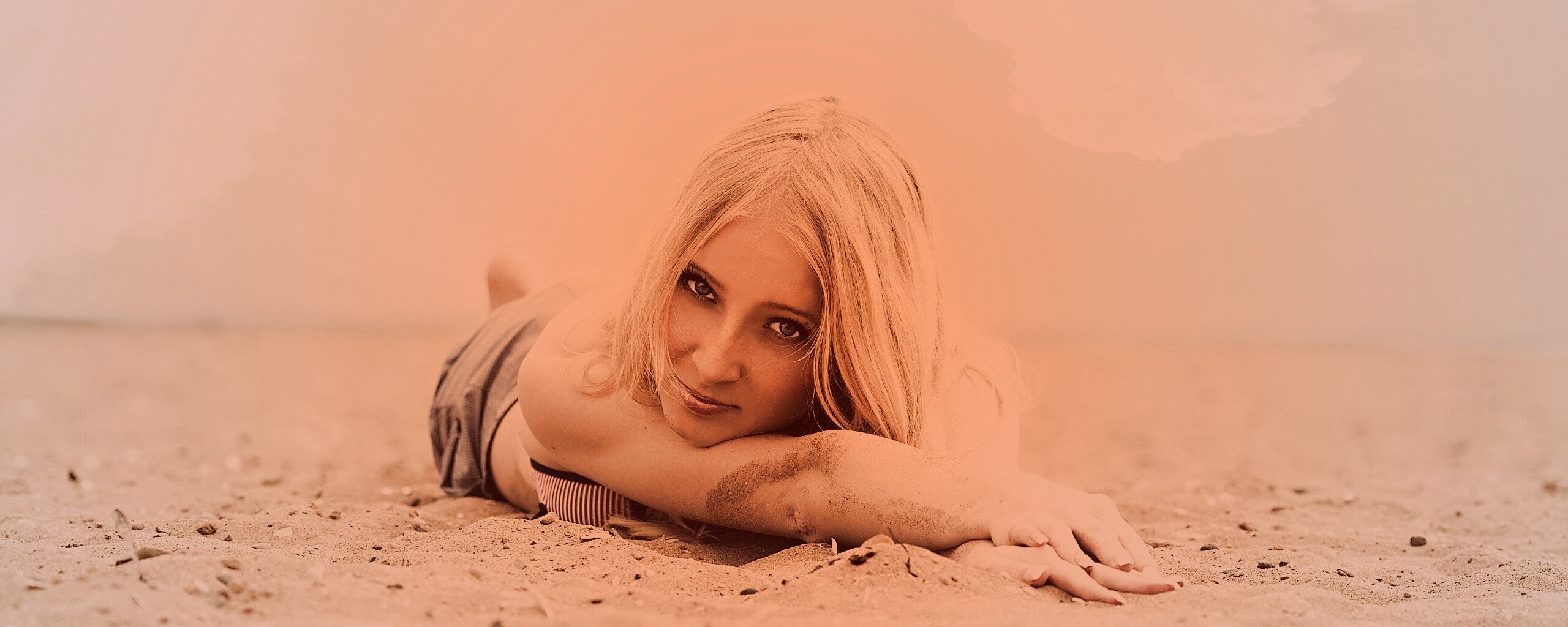 Обои для рабочего стола «Девушка на песке» 2560х1024 с фильтром toaster (оригинал 5298х3744)