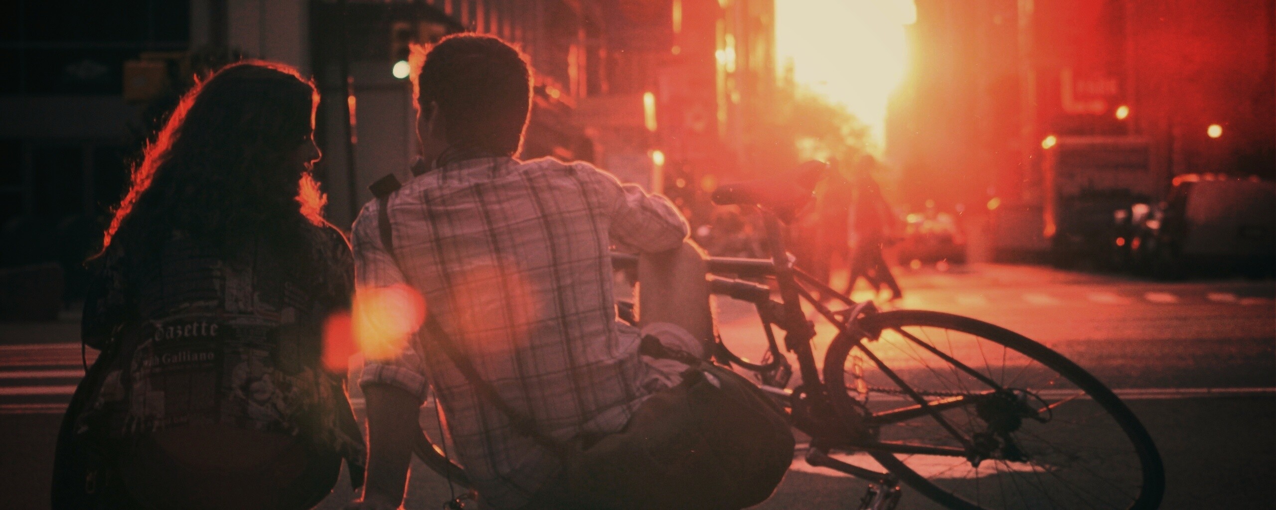 «Девушка и парень с велосипедом на закате»
