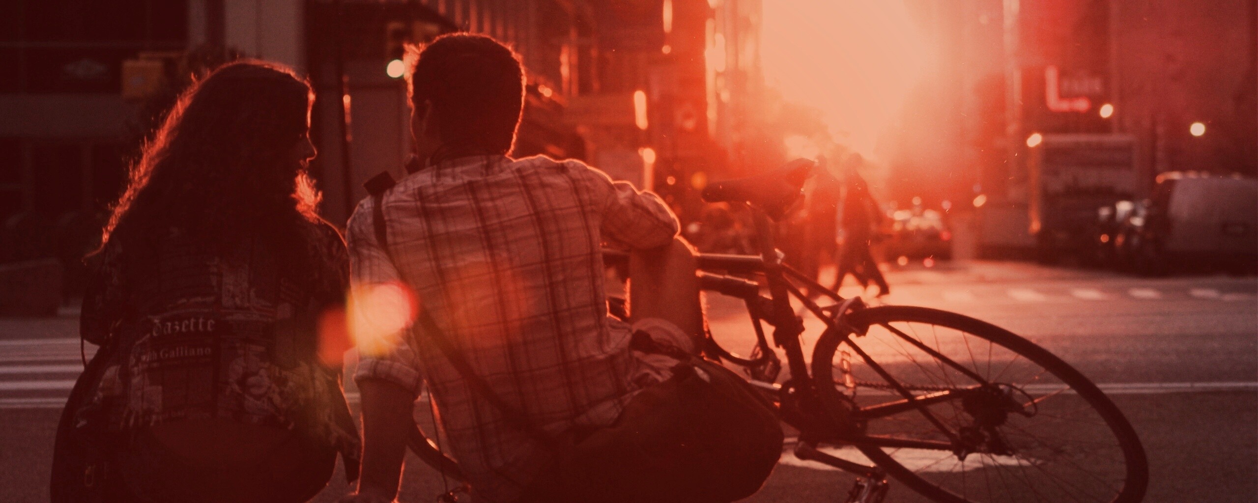 Обои для рабочего стола «Девушка и парень с велосипедом на закате» 2560х1024 с фильтром toaster (оригинал 2560х1600)