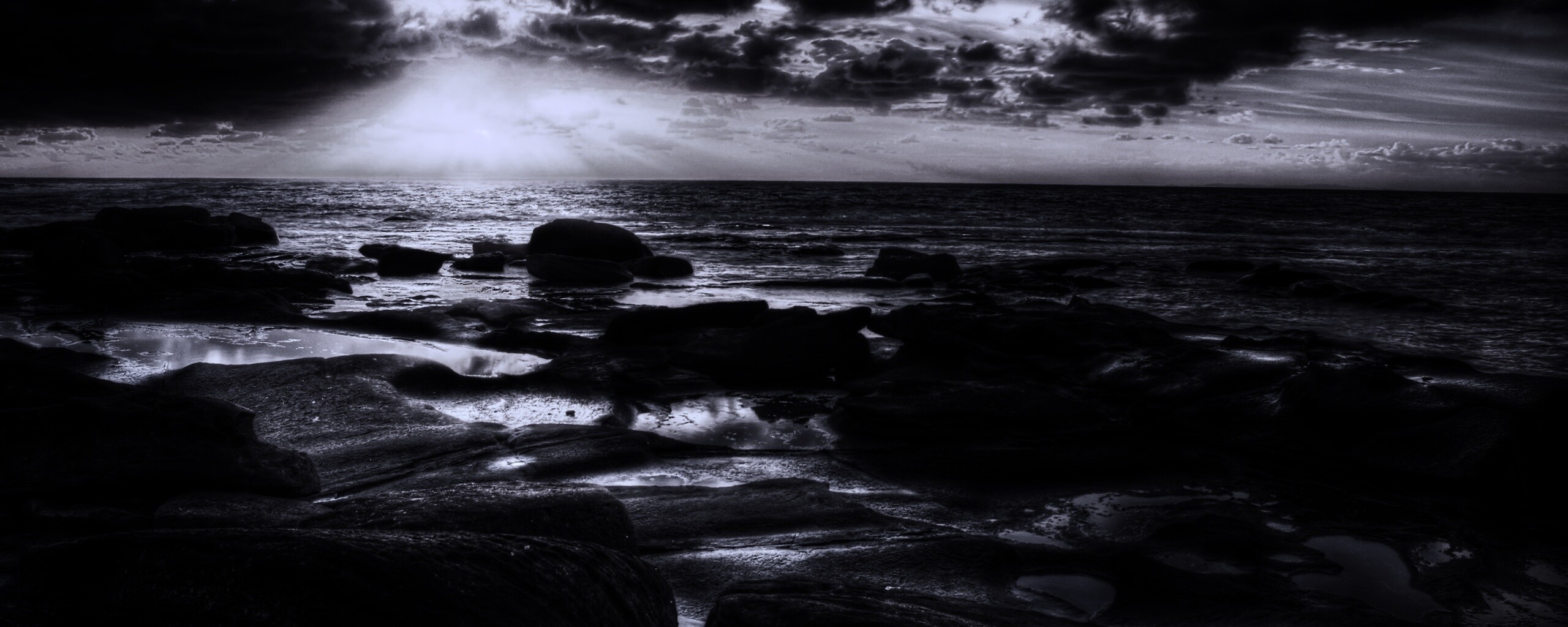 Обои для рабочего стола «Каменистый берег на закате» 2560х1024 с фильтром gotham (оригинал 2560х1600)