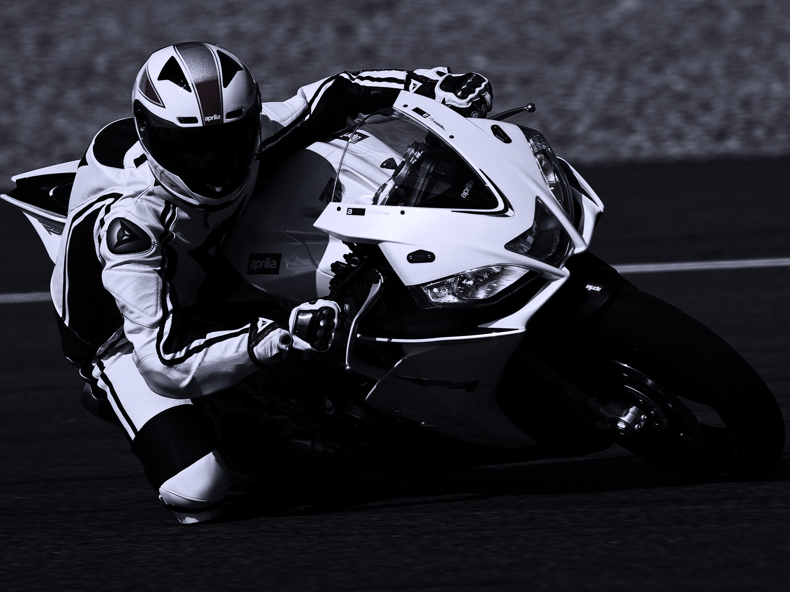 Обои для рабочего стола «Байкер в белой экиперовкена Априлия РСВ4» 2560х1920 с фильтром gotham (оригинал 3200х2000)