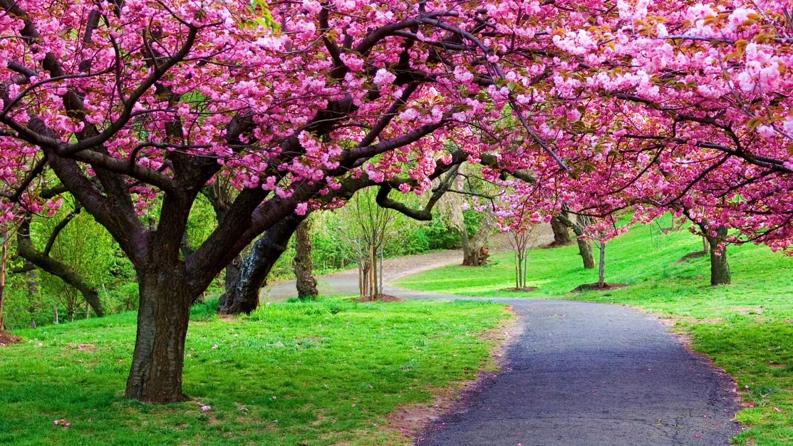 Обои для рабочего стола «Дорожка между деревьями» 1600х900 с фильтром vibrance (оригинал 1920х1080)