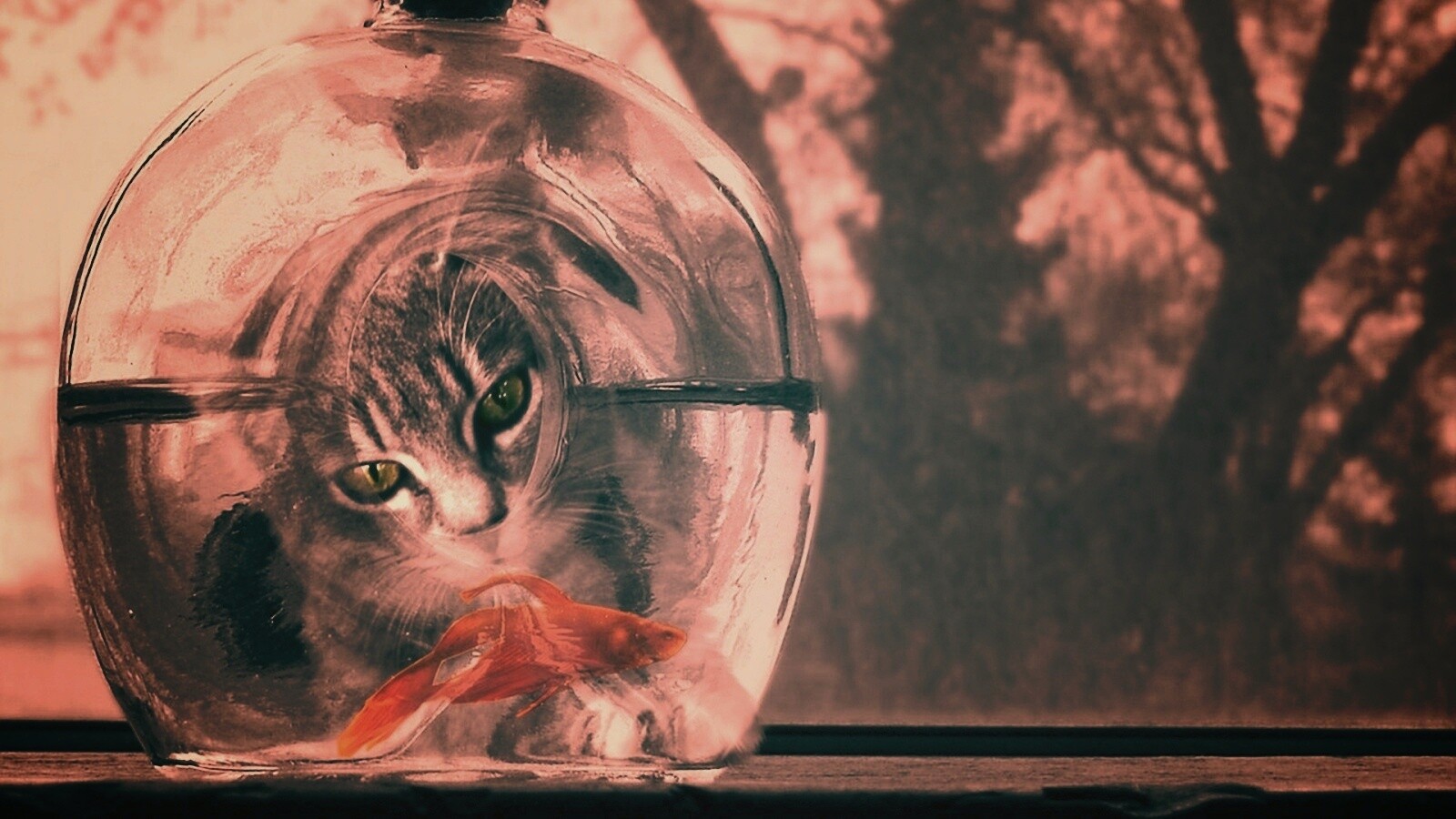 «Кот наблюдает за рыбкой в бутылке»