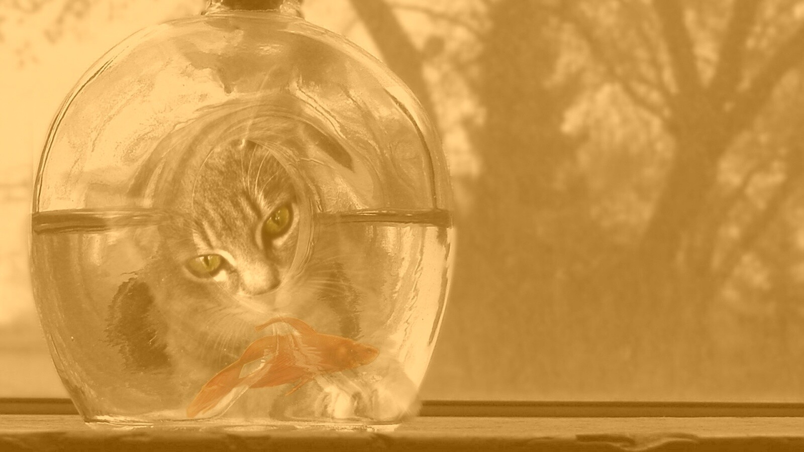 «Кот наблюдает за рыбкой в бутылке»