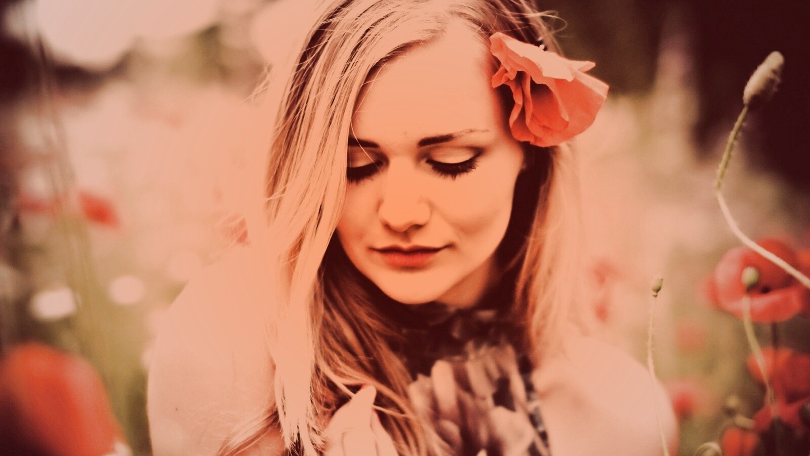 Обои для рабочего стола «Блондинка в маках» 1600х900 с фильтром toaster (оригинал 2560х1600)