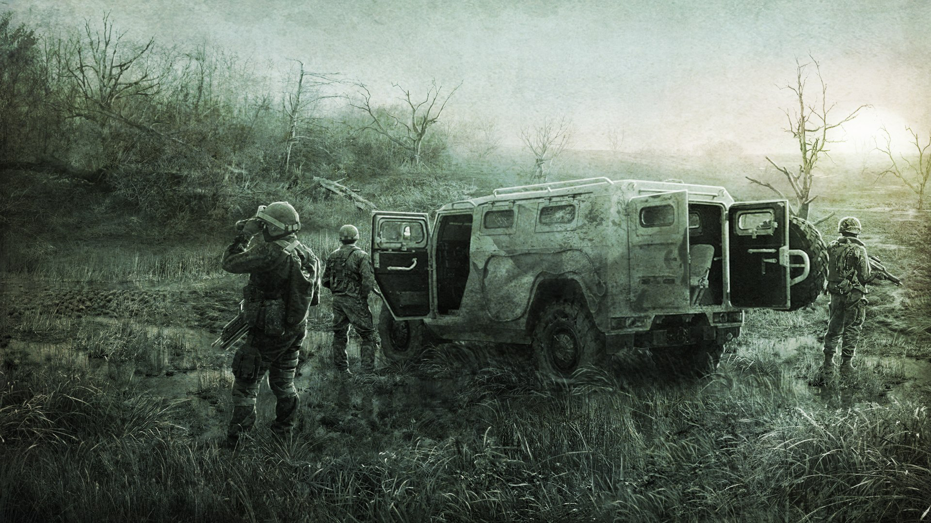 «Солдаты из сталкера на болоте»