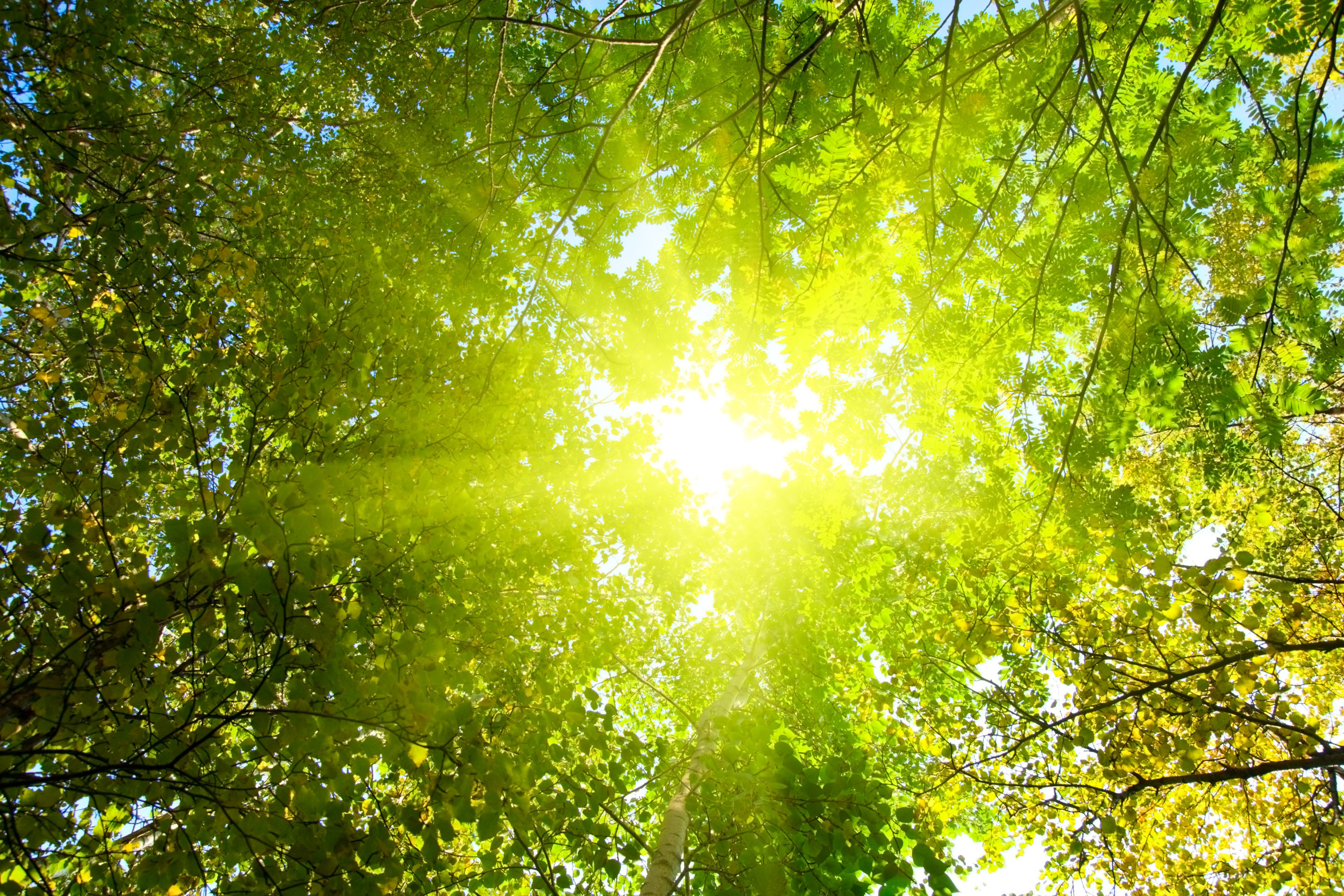 Обои для рабочего стола «Яркий зеленоватый свет пробивающийся сквозь листву» 3000х2000